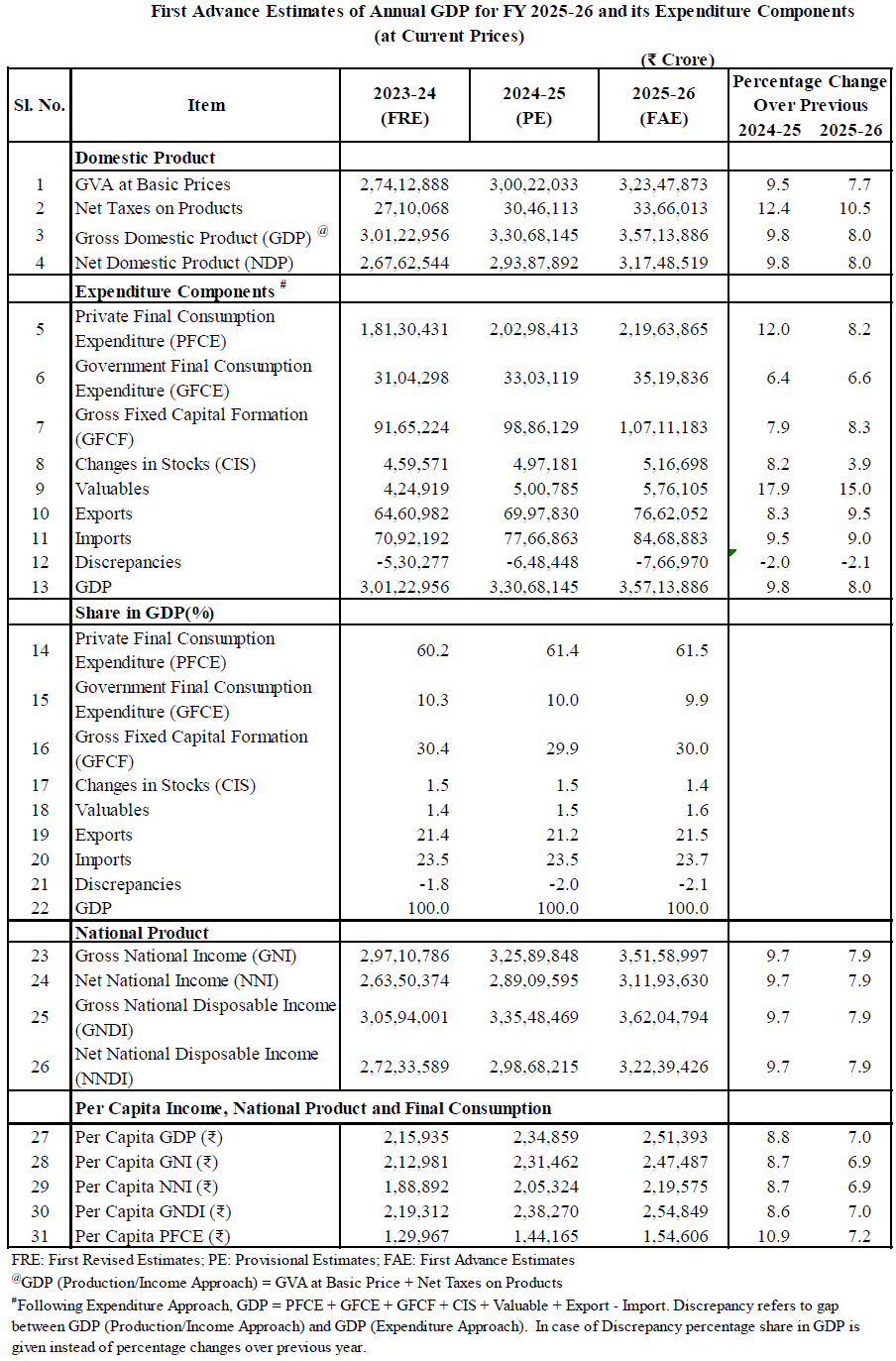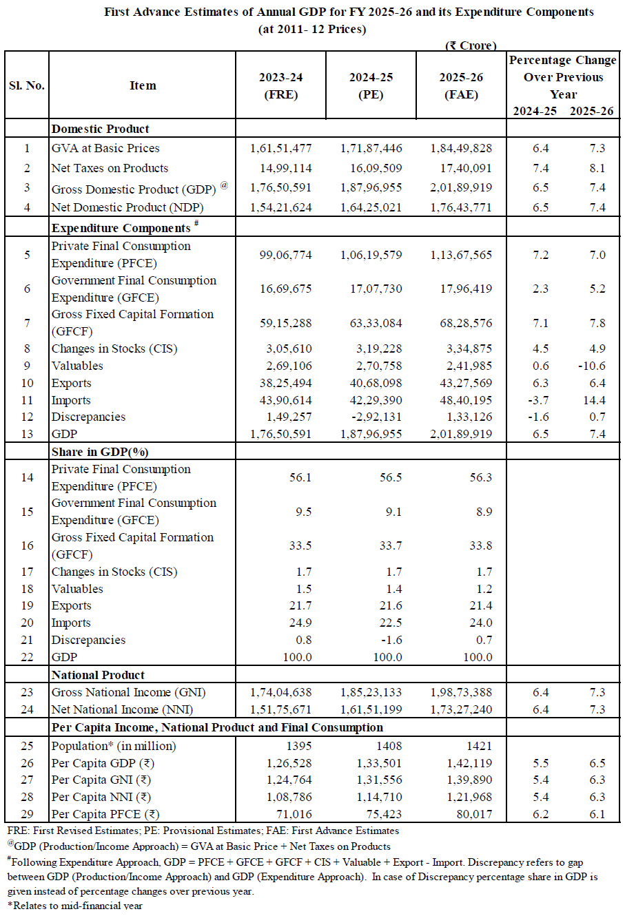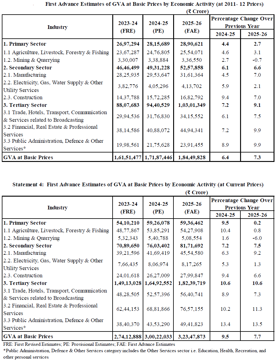 Real GVA is estimated at ₹184.50 lakh crore in the FY 2025-26, against the Provisional Estimates (PE) for the FY 2024-25 of ₹171.87 lakh crore, registering a growth rate of 7.3%