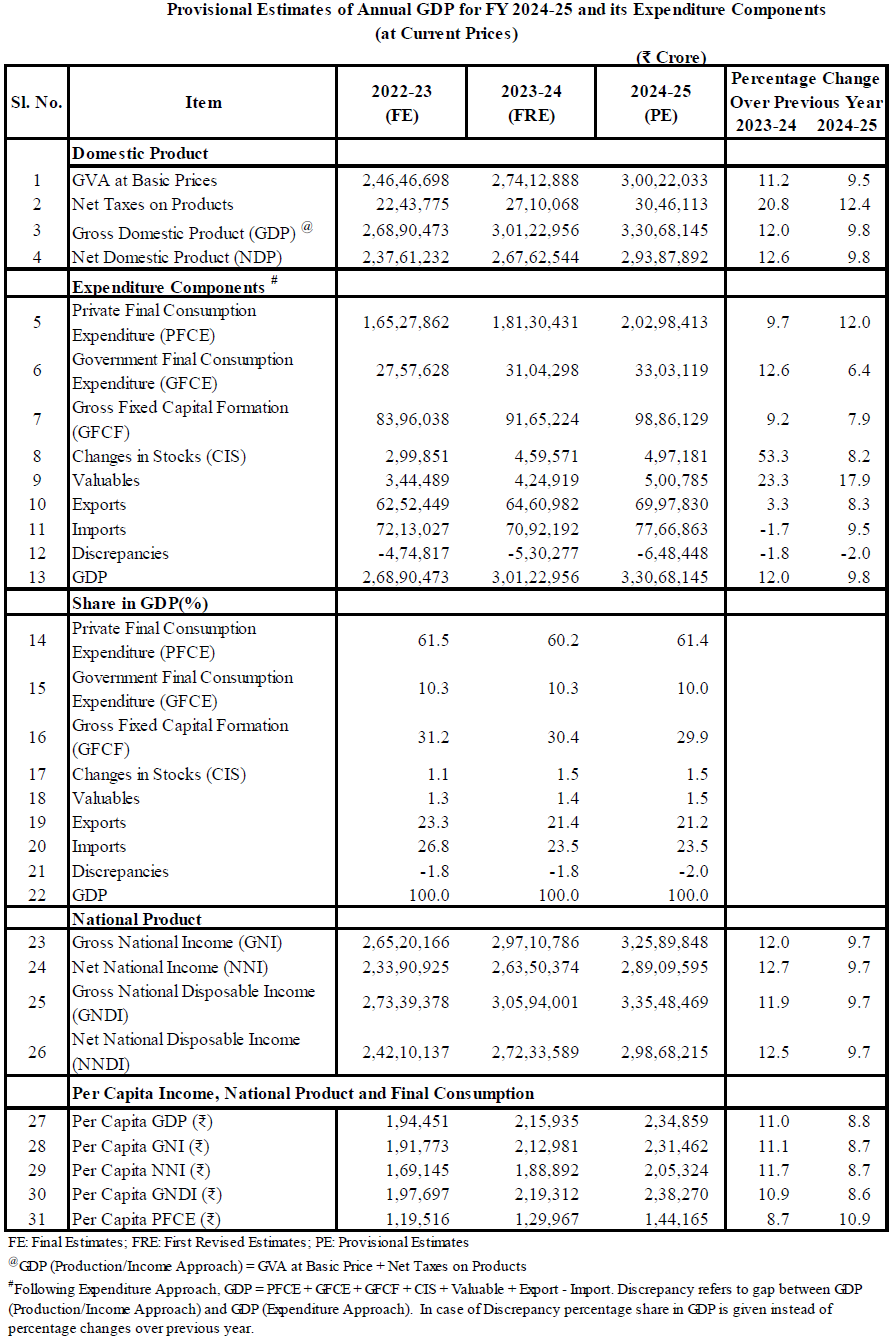 Nominal GDP or GDP at Current Prices is estimated to attain a level of Rs 330.68 lakh crore in the FY 2024-25, against Rs 301.23 lakh crore in FY 2023-24, showing a growth rate of 9.8%