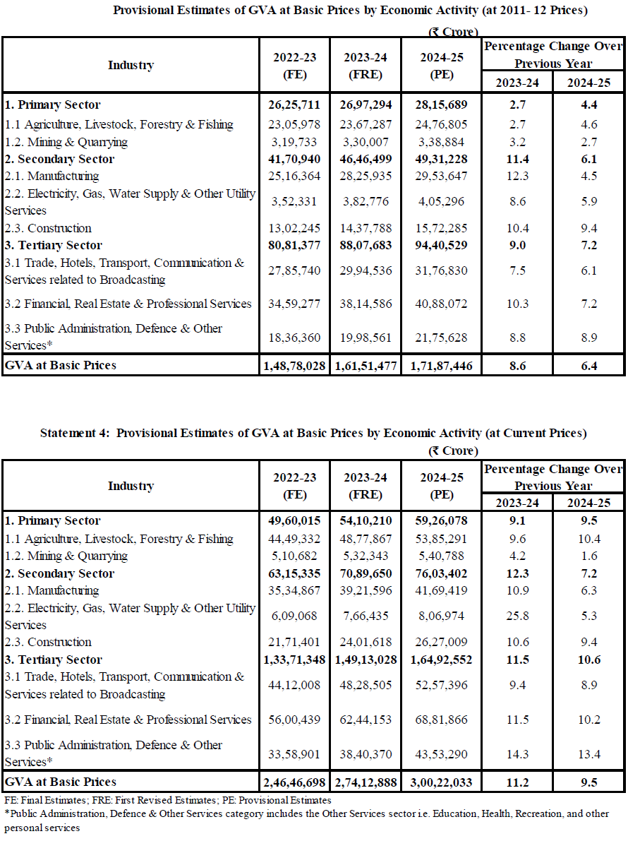 Real GVA is estimated at Rs 171.87 lakh crore in the FY 2024-25, against the FRE for the FY 2023-24 of Rs 161.51 lakh crore, registering a growth rate of 6.4%.