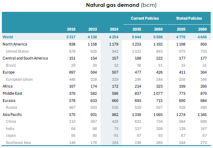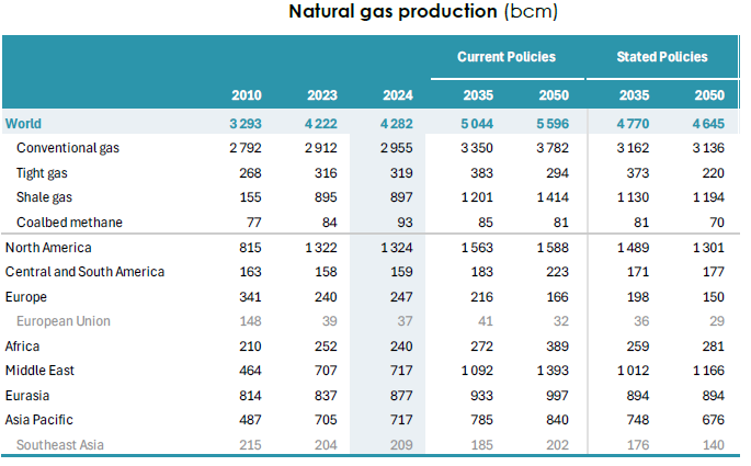 IEA expects world natural gas production to increase from 4,282 bcm in 2024 to 5,596 bcm by 2050 in Current Policies scenario and 4,645 bcm in Stated Policies scenario, which is 951 bcm lower in the latter