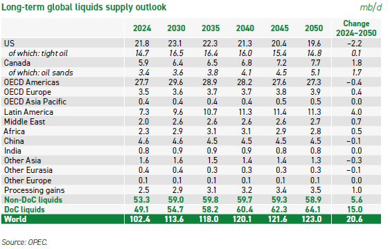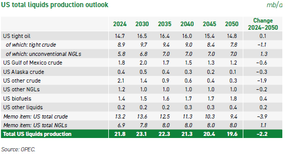 On the 5-year forecast interval, OPEC expects US total liquids supply to peak at 23.1 mb/d in 2030, before slowly decreasing to 19.6 mb/d in 2050, as captured in the Table: