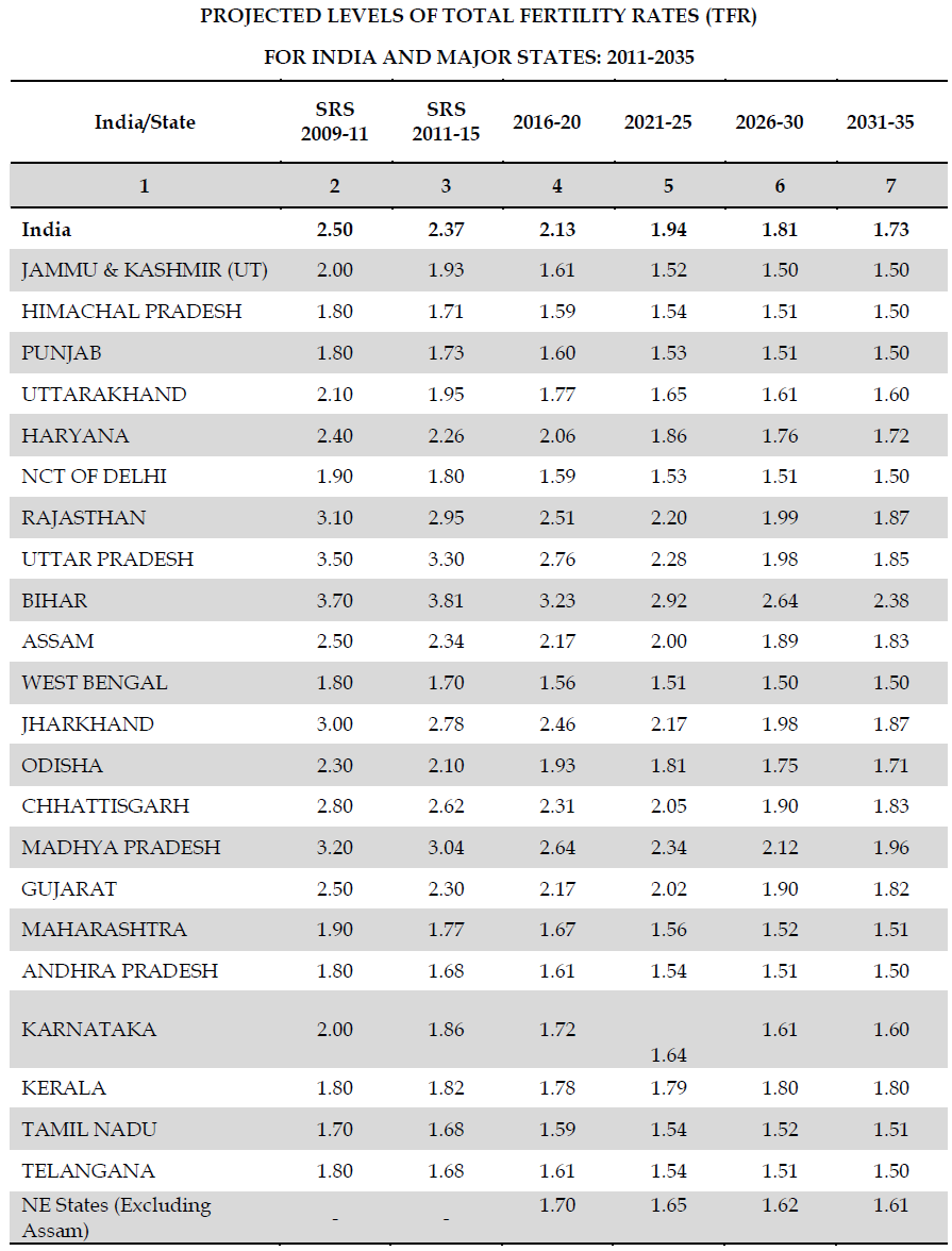 By 2031-2035, only Bihar (TFR=2.38) is expected to have a TFR of more than 2.1