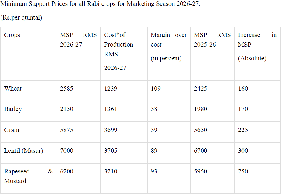 - The Cabinet Committee on Economic Affairs (CCEA) has approved the increase in the Minimum Support Prices (MSP) for all mandated Rabi Crops for Marketing Season 2026-27