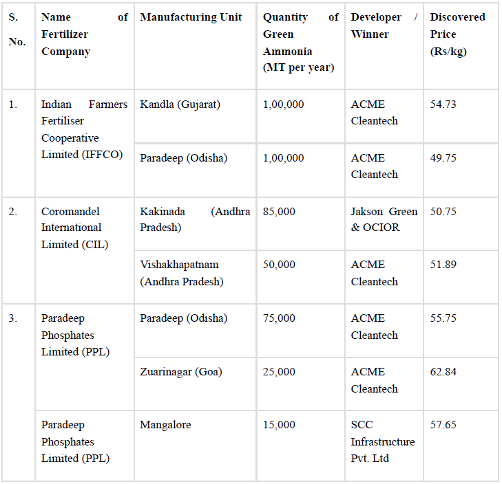 Under the Strategic Interventions for Green Hydrogen Transition (SIGHT) Programme, the Solar Energy Corporation of India (SECI) conducted competitive bidding for the supply of green ammonia to fertilizer units nationwide