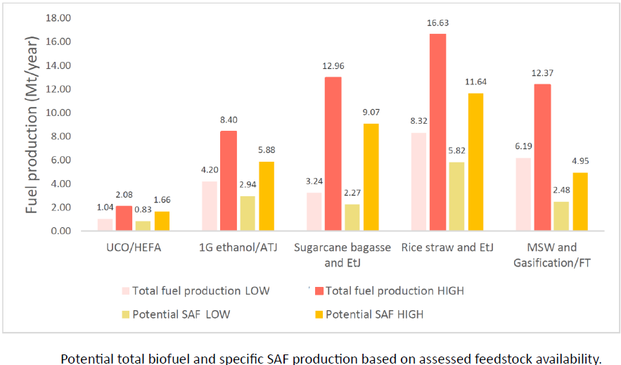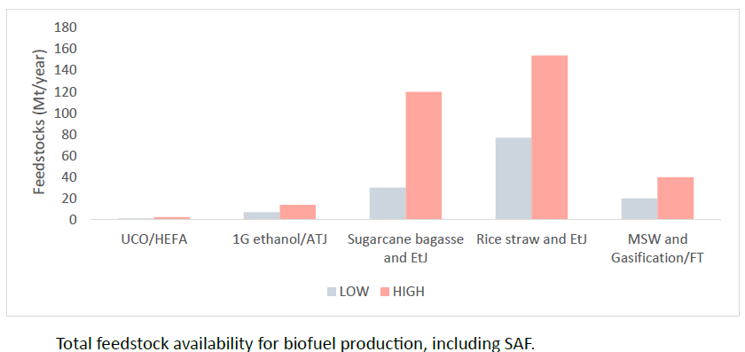 - This study carried out a comprehensive assessment of feedstocks available in India and potential SAF technologies that could utilize them. India has vast resources of bio-based feedstocks that could potentially be used to produce SAF, with sugarcane bagasse, rice straw, and municipal solid waste forming the bulk of the biogenic feedstocks