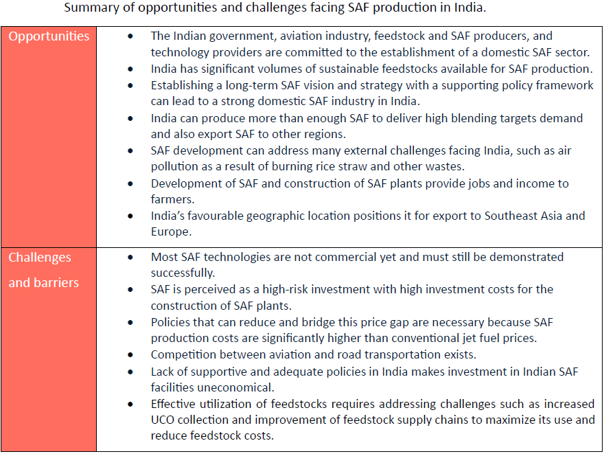 - Urgent action is needed to establish a policy framework for SAF development in India. Multiple companies are engaged in SAF development and commercialization in India but are faced with high construction costs and high production costs. The right mixture of policies can facilitate the rapid development of a SAF industry in India