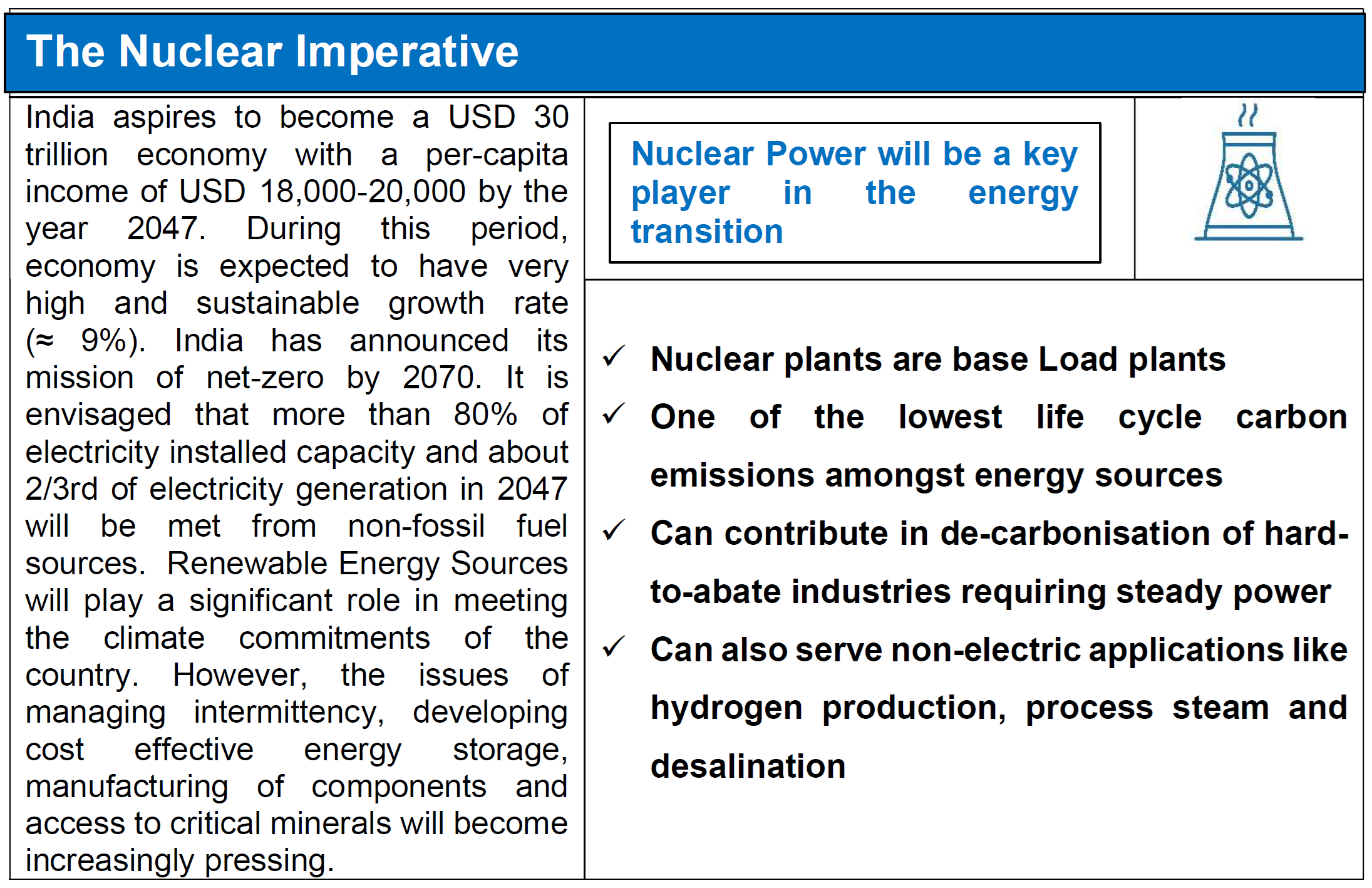 - In order to fulfill the promise of nuclear towards a cleaner and greener tomorrow, Government of India has taken decisive steps for reaching 100 GW nuclear capacity by 2047