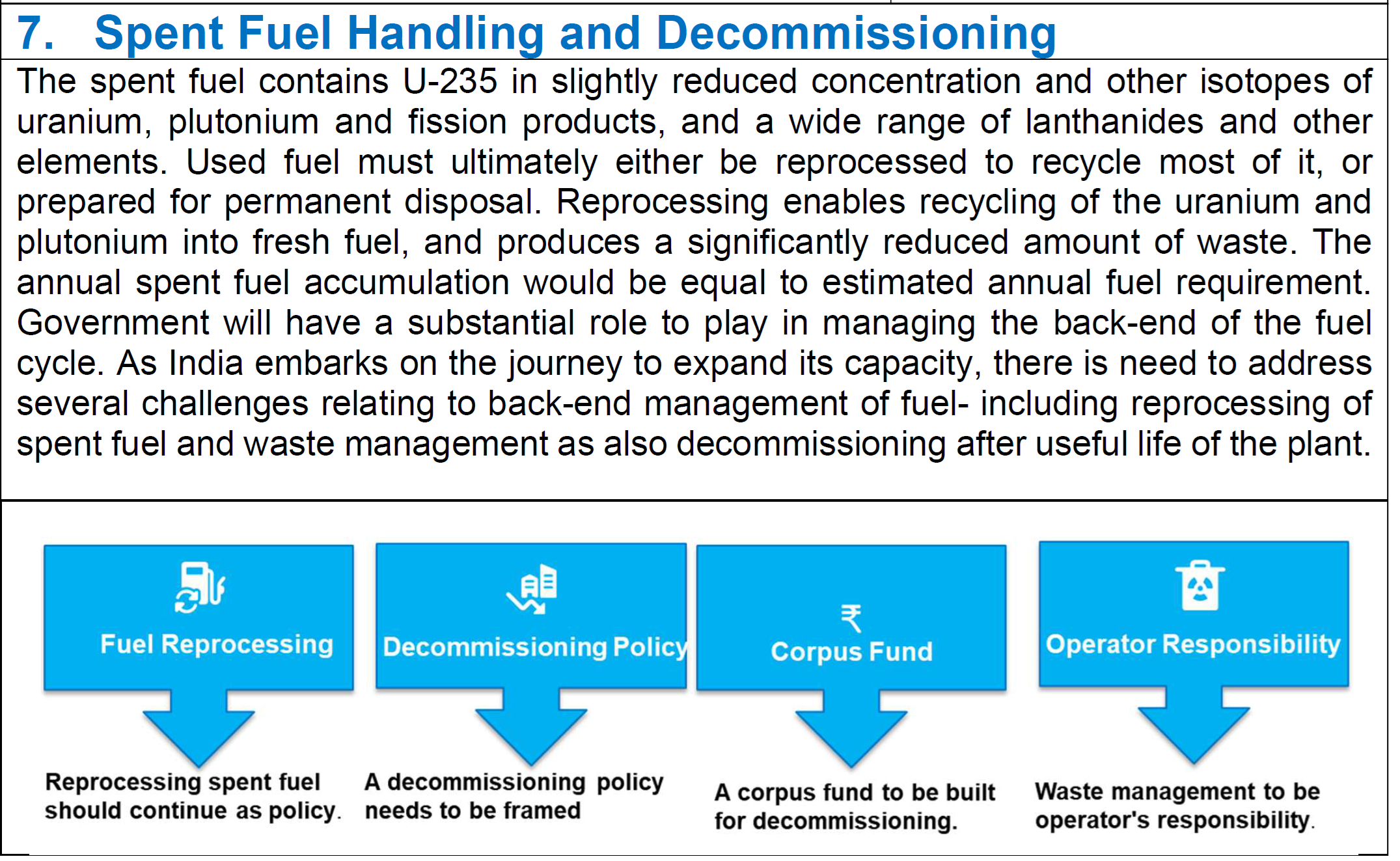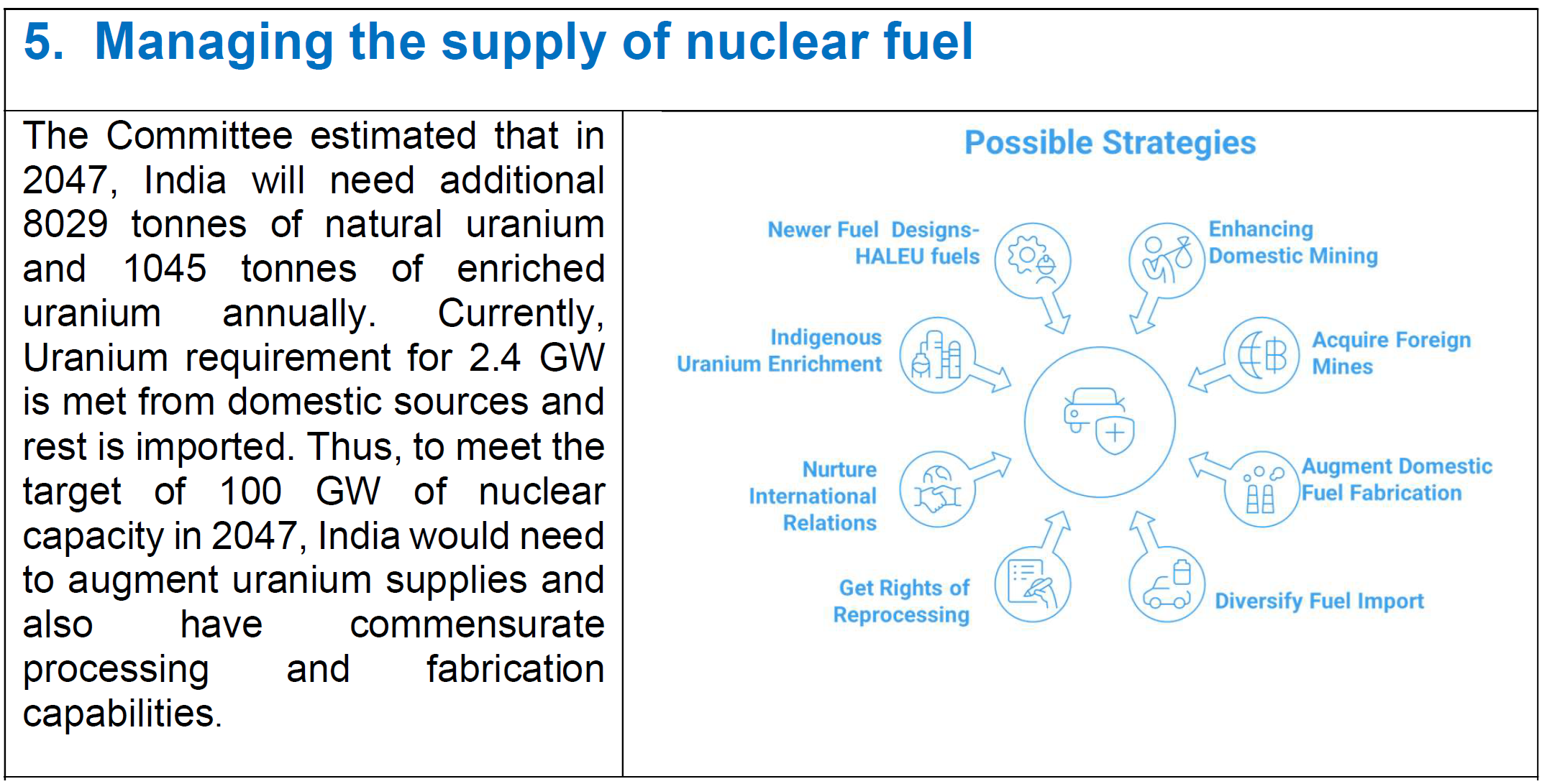 - In order to prepare a roadmap for 100 GW nuclear capacity by 2047, Ministry of Power had constituted a committee. The Committee held several rounds of discussions on all aspects of the journey towards 100 GW by 2047. Challenges have been identified and recommendations have been given, through its report