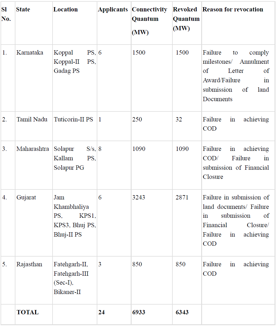 Ministry of Power has provided an update that since 2022, Central Transmission Utility of India Limited (CTUIL) has revoked connectivity of 24 grantees with a Renewable Energy (RE) capacity of 6,343 MW. The cancellations are on account of developer delays and not due to transmission side delays