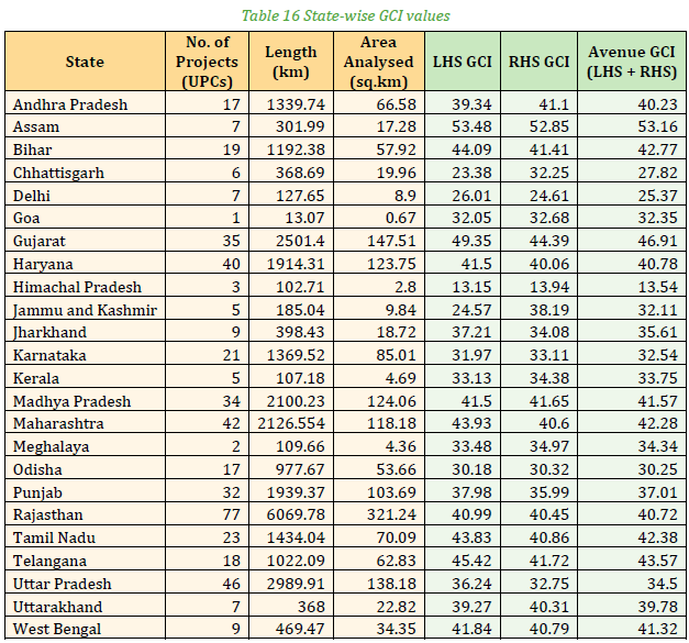Following table shows the state-wise segregation of no. of projects evaluated; their length; and respective LHS, RHS and Avenue GCI as cumulative values
