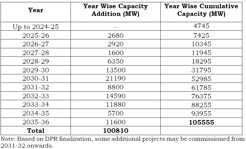 As per information available with CEA, Pumped Storage Projects with an aggregate capacity of 100,810 MW have been envisaged to be commissioned by the year 2035-36 including 11620 MW of PSP under construction. Summary of year wise capacity addition is as given in Table below: