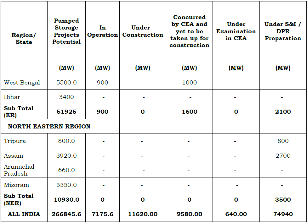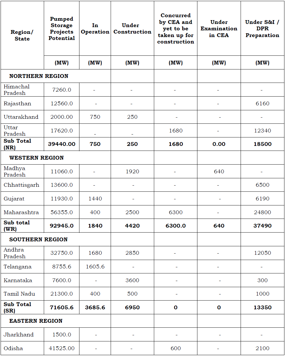 Summary of Region-wise and State-wise Pumped Storage Project development in the country is as given in Table below: