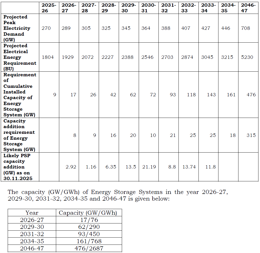 As per CEA`s Studies, the requirement of Storage Capacity on all-India basis is projected to increase to 62 GW by 2029-30; 161 GW by 2034-35 and 476 GW by 2046-47. Year-wise details are as per Table below: