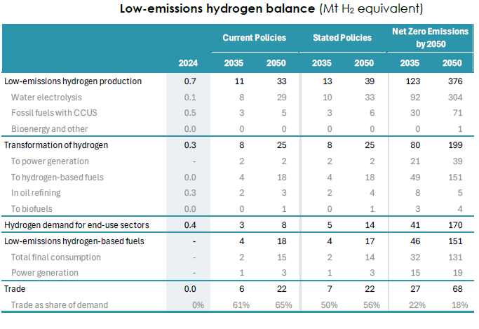 Table below captures IEA’s assessment of low-emissions hydrogen balance under Current Policies / Stated Polices and Net Zero Emissions scenarios