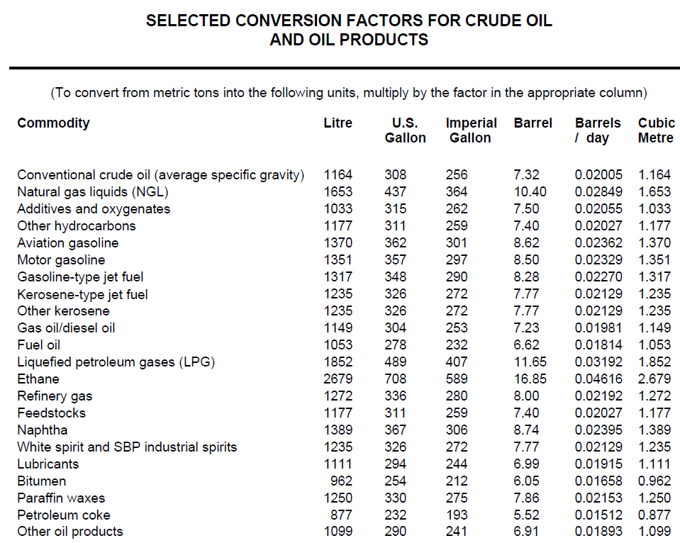• Liquefied Petroleum Gas (LPG): ~11.65 barrels per tonne