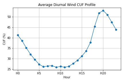 Our commercial modelling framework uses full 8760-hour wind CUF profiles to capture hour-by-hour variability across the year.