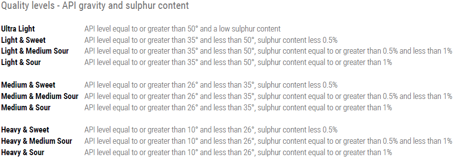 While there is no strict universal convention, we capture ENI`s definition of quality levels of crude oils in terms of API gravity and sulphur content (Source: ENI`s World Energy Review)