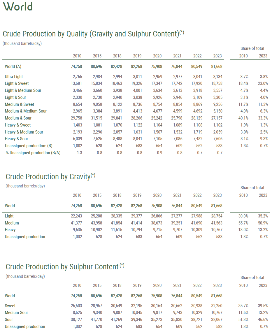 We again pick up the page from ENI`s World Energy Review as below, that captures world crude produciton by API / Sulphur content