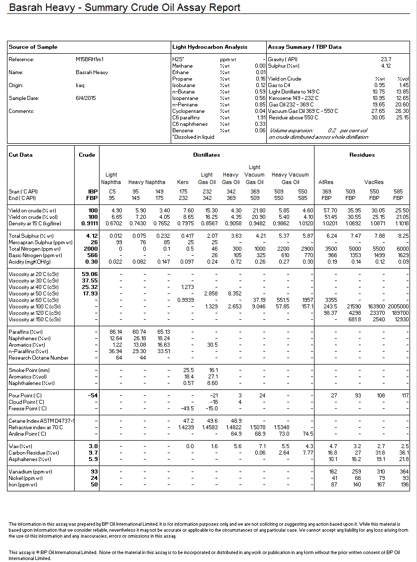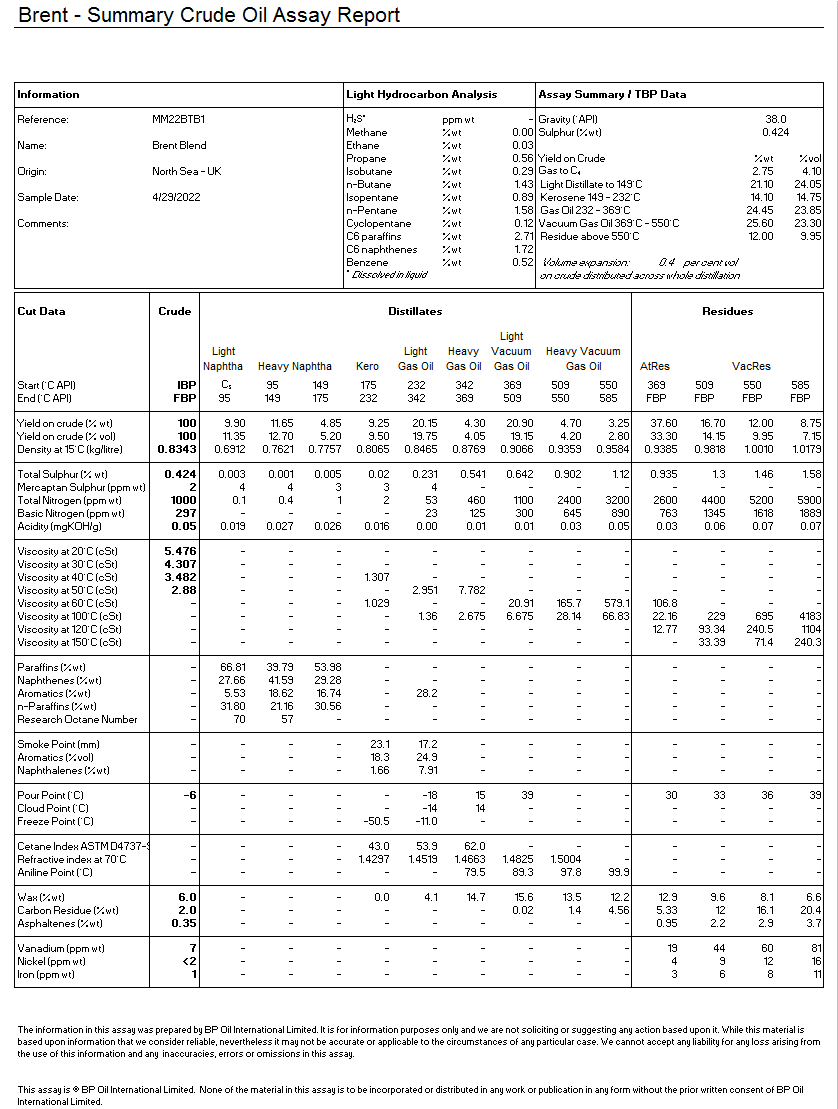 Companies like bp, Equinor, ExxonMobil publish assays of various crudes that they produce. We present assays of Brent (API 38 / Sulphur 0.424%) and Basrah Heavy (API 23.7 / Sulphur 4.12%) from bp's website to explain what all information is contained in the assay. While the former is Light / Sweet, the latter is Heavy / Sour