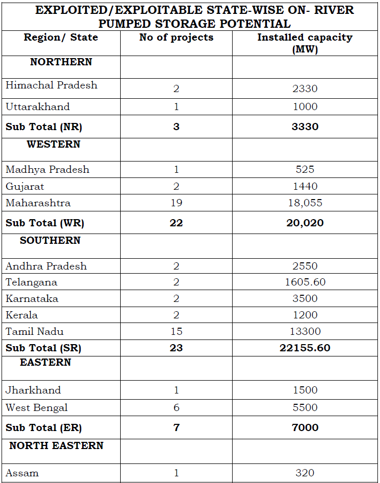 Table below captures state-wise break up of exploited / exploitable pumped hydro potential of 59,035.6 MW