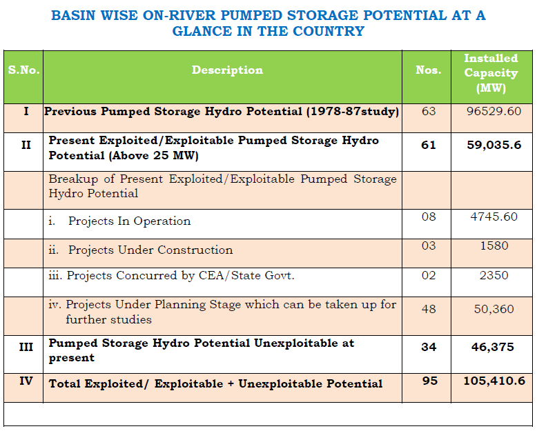 Table below captures India’s Pumped Hydro Potential at a glance, comprising 59,035.6 MW of exploited / exploitable potential (above 25 MW) and 46,375 MW unexploitable at present