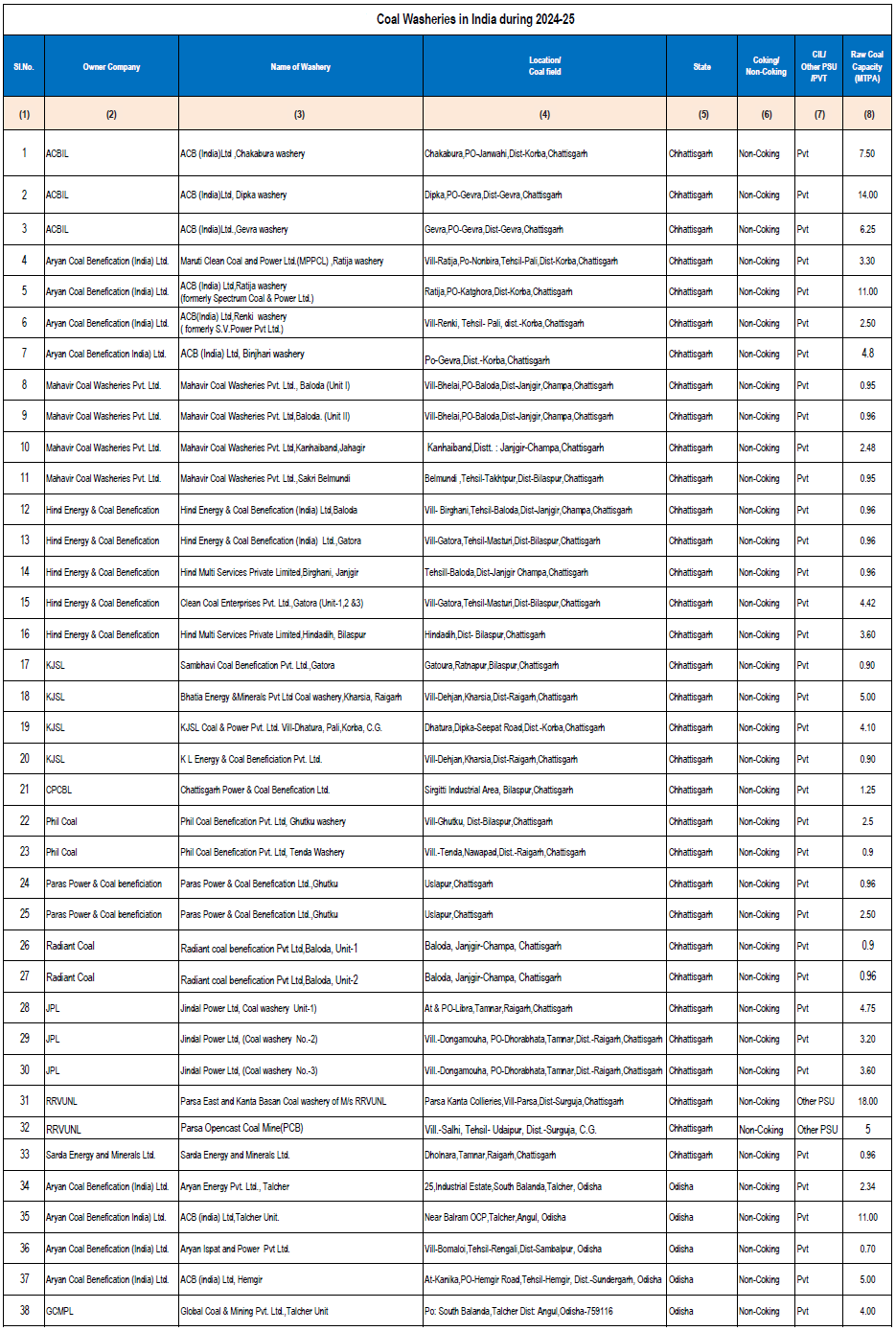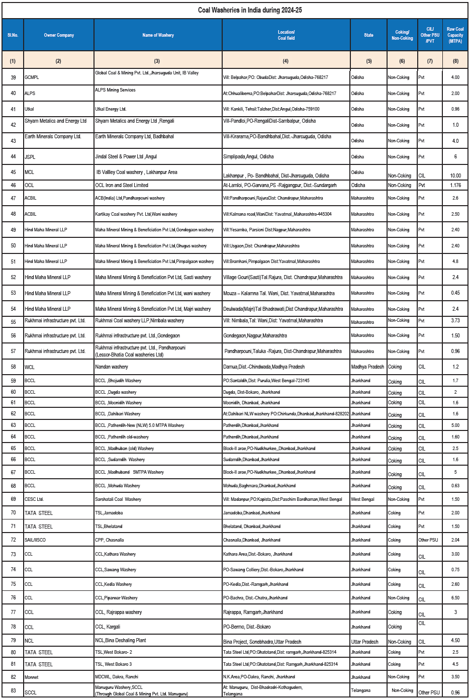 For the benefit of readers, we capture the list of coal washeries in India. The latest total capacity of the coal washeries is 263.57 MTPA