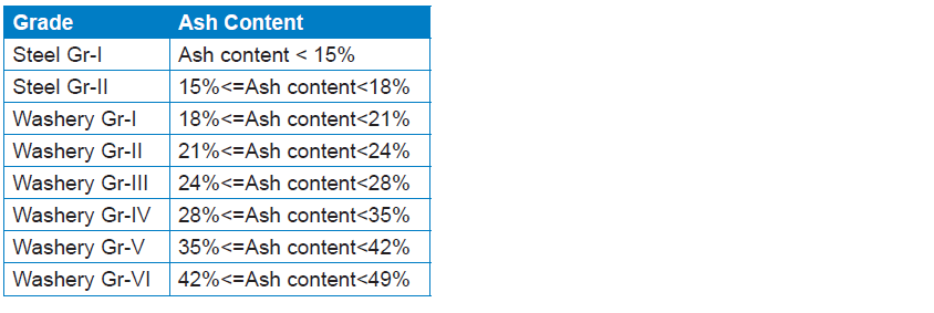 In India, coking coal has been categorized or graded on the basis of ash content as per following scheme: