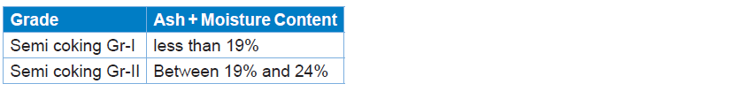 In India, semi coking coal has been categorized or graded on the basis of ash and moisture content as per following scheme:
