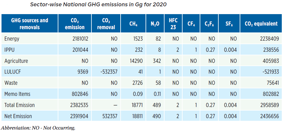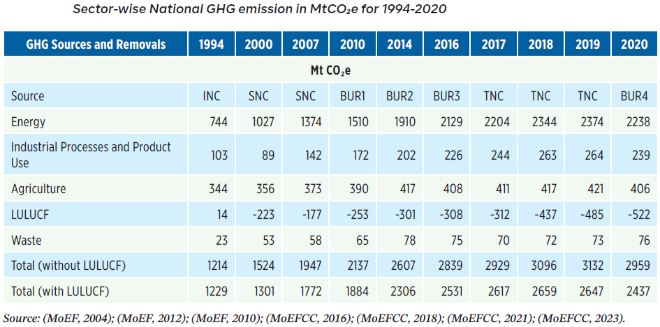 | Year | Energy MMTPA CO2e | Industrial Processes and Product Use MMTPA CO2e | Agriculture MMTPA CO2e | Waste MMTPA CO2e | Total (without LULUCF) MMTPA CO2e | LULUCF MMTPA | Total (with LULUCF) MMTPA CO2e | Share Energy percent | Share Industrial Processes and Product Use percent | Share Agriculture percent | Share Waste percent | Total without LULUCF |