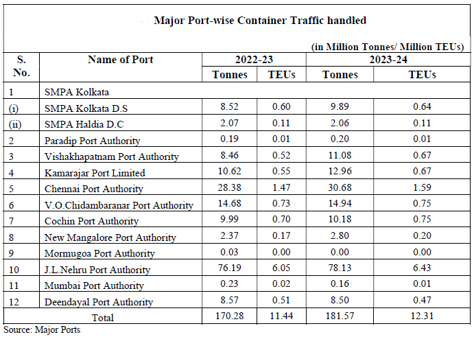 At the All-India level, the Container traffic in 2023-24 was 181.57 million tonnes, corresponding to 12.31 million TEUs. This translates into an average multiple of 14.75