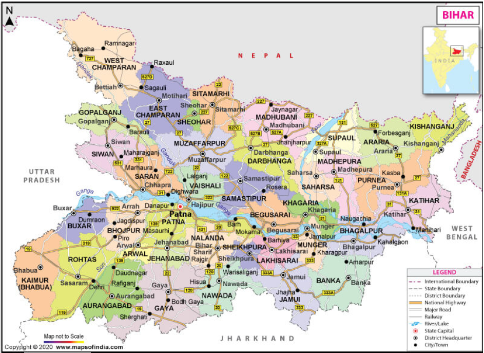 - It is surrounded by West Bengal in the east, Uttar Pradesh in the west, Nepal in the north and the state of Jharkhand in the south