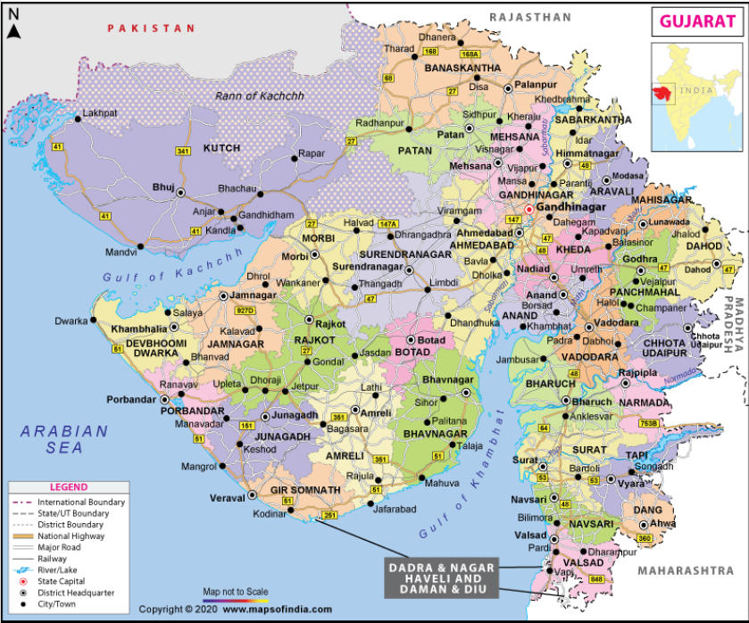 - Gujarat is located on the western coast of India and has the longest coastline of 1,600 km among all the states in the country. It is bounded by Pakistan to the northwest and by the Indian states of Rajasthan to the north, Madhya Pradesh to the east and Maharashtra to the southeast