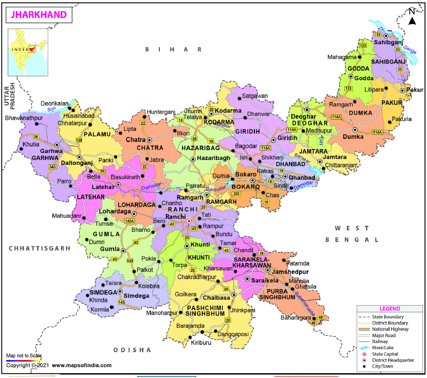 - Jharkhand is located in eastern India, It became an independent state after splitting from Bihar on November 15, 2000. It shares its borders with Bihar to the north, Uttar Pradesh to the northwest,Chhattisgarh to the west, Odisha to the south, and West Bengal to the east