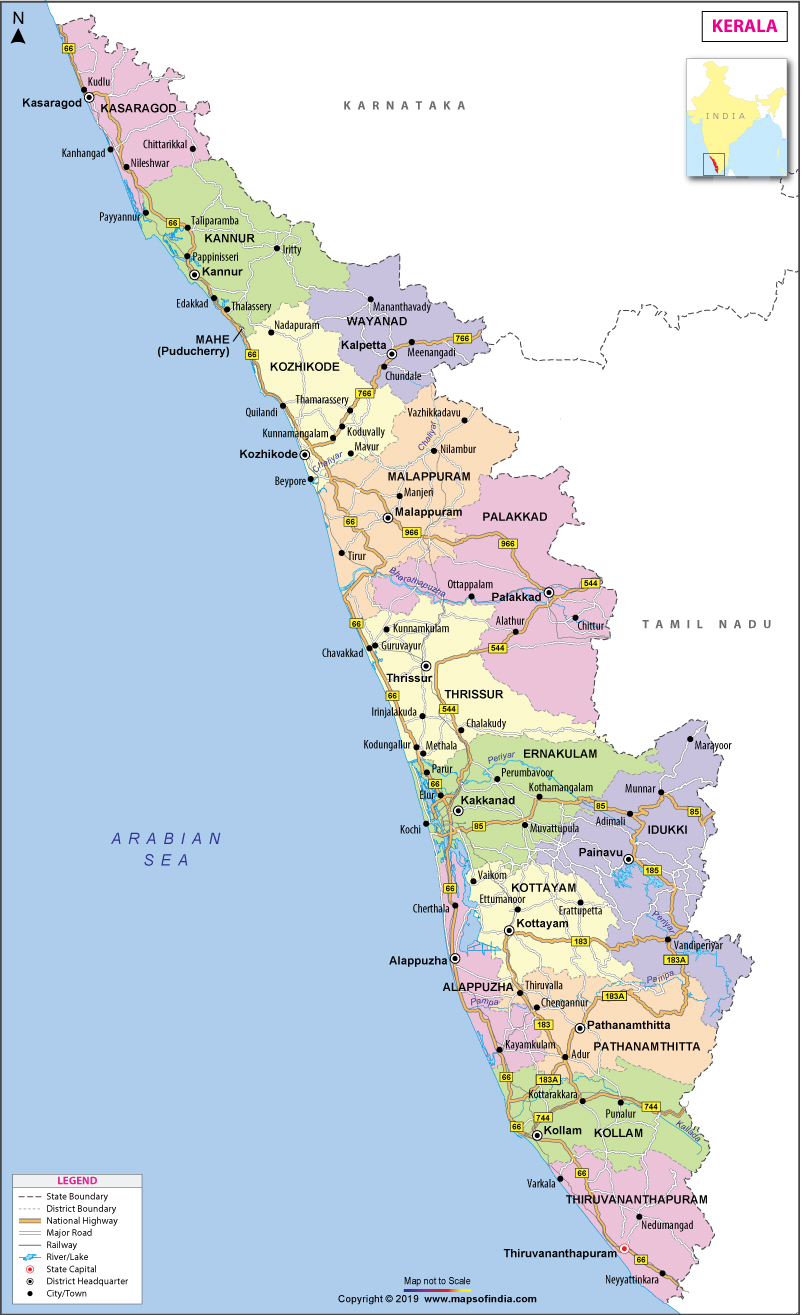 - Kerala is located in the extreme of the Southwest peninsula of India, situated between the Western Ghats on the east and the Arabian Sea on the west. It shares its borders with Karnataka to the north and northeast, Tamil Nadu to the east and south, and the Lakshadweep Sea to the west