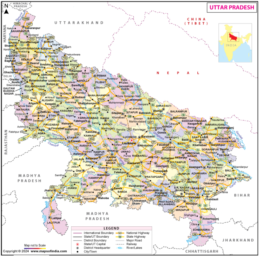 - UP is the fourth largest state of India in terms of area. Spread over an area of 2,43,286 Square km., UP has 75 districts