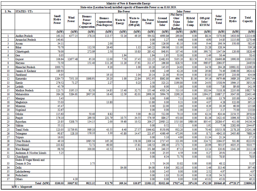 At the time of writing, statewise installed renewable capacity data as on 31st March 2025 was available from Ministry of New & Renewable Energy (MNRE). The same is captured in the Table below. MNRE includes Large Hydro while presenting total Renewable installed capacity