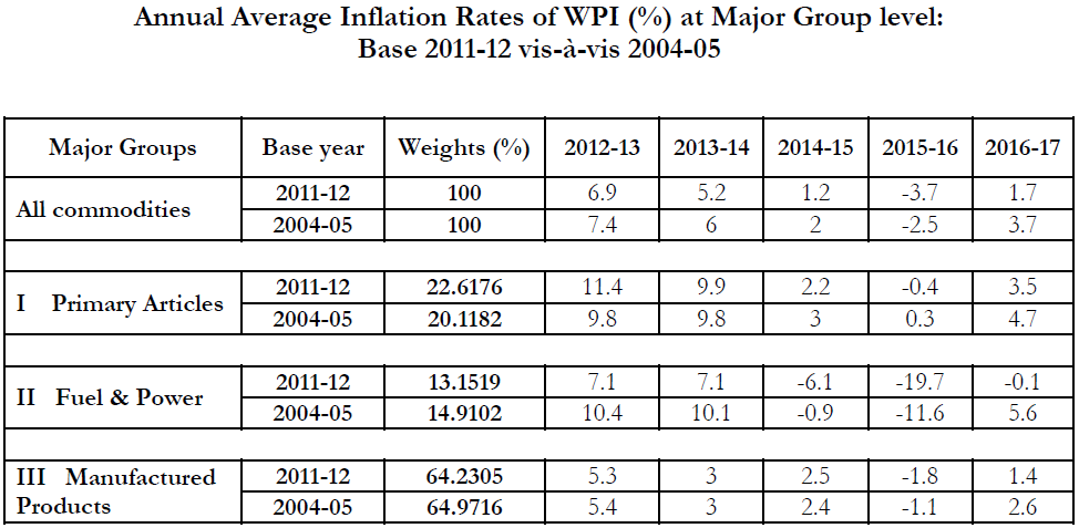 We also capture Annual Average Inflation Rates of WPI (%) at Major Group level: Base 2011-12 vs 2004-05, as per Press Release Dated 12th May 2017: Revision of base year of All-India Wholesale Price Index (WPI) from 2004-05 to 2011-12