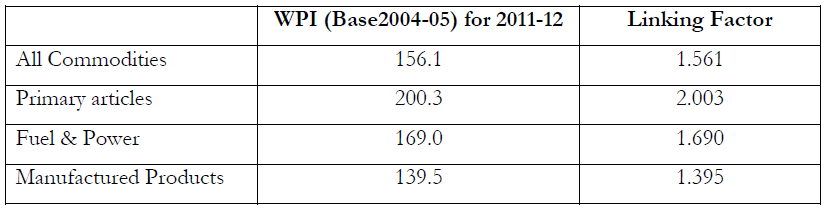 In view of the conceptual and methodological difference between the 2004-05 and 2011-12 series, the estimate of linking factor will vary depending on the type of method used. Therefore, users are free to choose any method as may be considered appropriate by them. However, as in the past, in order to maintain continuity in the time series data on wholesale price index, the linking factor using the arithmetic conversion method for All Commodities and the three major groups of WPI are given in the Table below
