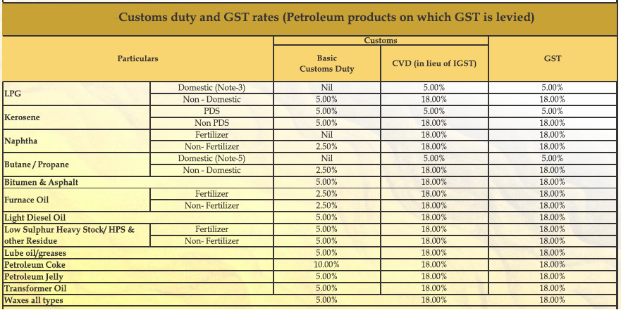 However, all other petroleum products are under GST. Table below captures Customs Duty and GST rates on these petroleum products
