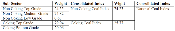- The Sub-Sector Indices are averaged to give Indices for Non Coking Coal and Coking Coal. The weights for consolidation are as captured below