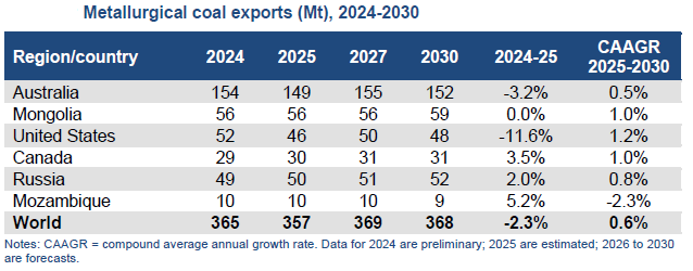 Coal 2025 – the latest annual market report from the International Energy Agency (IEA) – explores key developments in the global coal sector. Drawing on the latest data, it analyses recent trends and provides forecasts through 2030 for coal demand, supply and trade. Table below captures IEA estimates / forecasts for Metallurgical coal exports from 2024-30