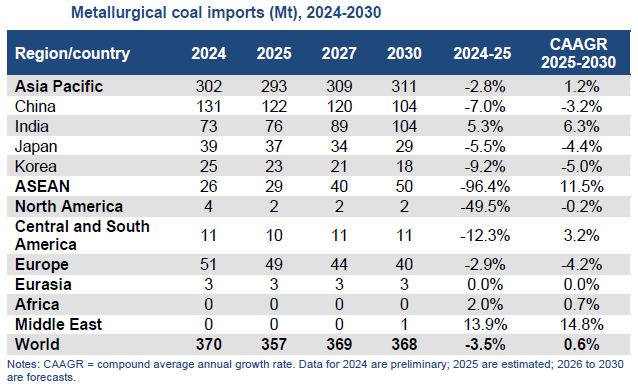 Coal 2025 – the latest annual market report from the International Energy Agency (IEA) – explores key developments in the global coal sector. Drawing on the latest data, it analyses recent trends and provides forecasts through 2030 for coal demand, supply and trade. Table below captures IEA estimates / forecasts for Metallurgical coal imports from 2024-30