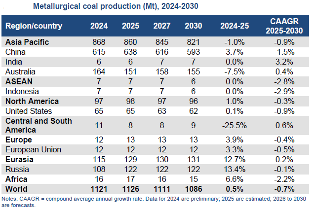 Coal 2025 – the latest annual market report from the International Energy Agency (IEA) – explores key developments in the global coal sector. Drawing on the latest data, it analyses recent trends and provides forecasts through 2030 for coal demand, supply and trade. Table below captures IEA estimates / forecasts for metallurgical (coking) coal production from 2024-30