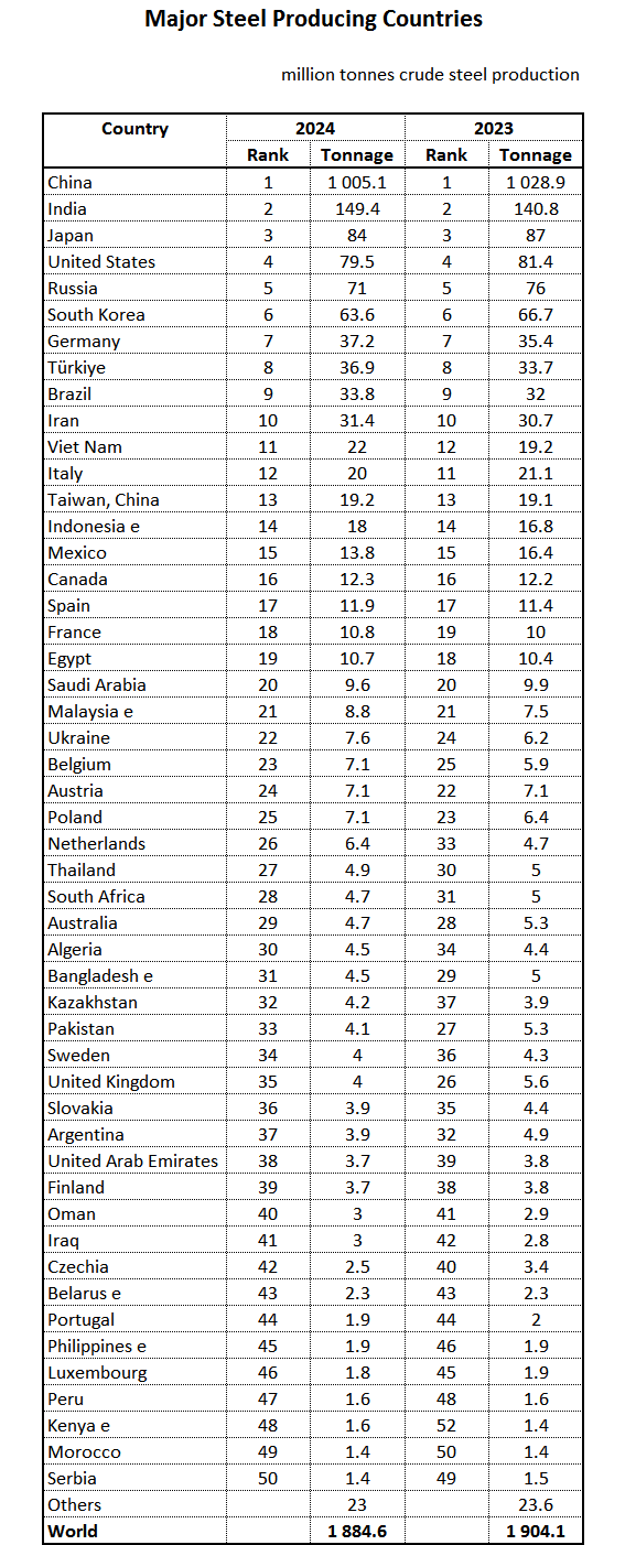 For the benefit of our readers, we capture country-wise crude steel production for 2023/2024 in the Table and Graph below (Source: World Steel Association)