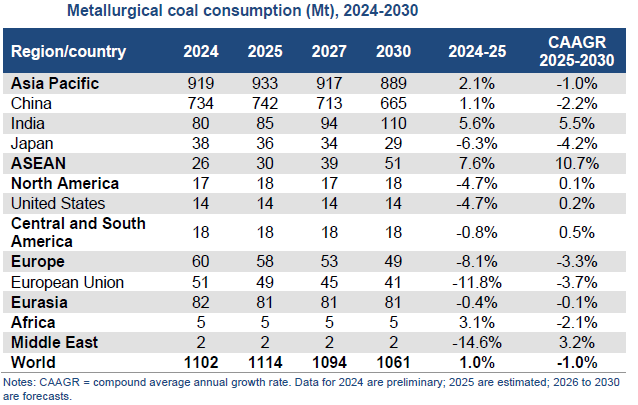 Coal 2025 – the latest annual market report from the International Energy Agency (IEA) – explores key developments in the global coal sector. Drawing on the latest data, it analyses recent trends and provides forecasts through 2030 for coal demand, supply and trade. Table below captures IEA estimates / forecasts for Metallurgical coal consumption from 2024-30