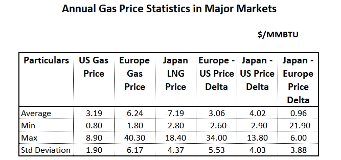 This section captures trend in annual Natural Gas prices in US, Europe and in LNG Japan price, as also inter-market deltas. In the Table: