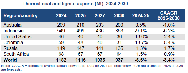 Coal 2025 – the latest annual market report from the International Energy Agency (IEA) – explores key developments in the global coal sector. Drawing on the latest data, it analyses recent trends and provides forecasts through 2030 for coal demand, supply and trade. Table below captures IEA estimates / forecasts for Thermal coal exports from 2024-30