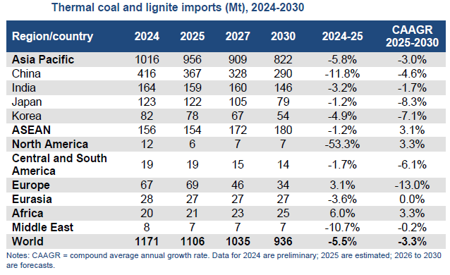 Coal 2025 – the latest annual market report from the International Energy Agency (IEA) – explores key developments in the global coal sector. Drawing on the latest data, it analyses recent trends and provides forecasts through 2030 for coal demand, supply and trade. Table below captures IEA estimates / forecasts for Thermal coal imports from 2024-30