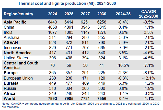 Coal 2025 – the latest annual market report from the International Energy Agency (IEA) – explores key developments in the global coal sector. Drawing on the latest data, it analyses recent trends and provides forecasts through 2030 for coal demand, supply and trade. Table below captures IEA estimates / forecasts for thermal coal production from 2024-30