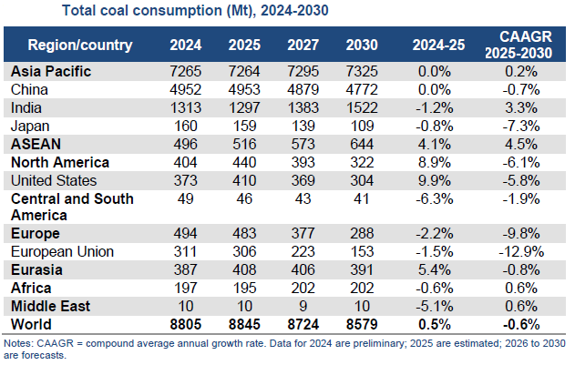 Coal 2025 – the latest annual market report from the International Energy Agency (IEA) – explores key developments in the global coal sector. Drawing on the latest data, it analyses recent trends and provides forecasts through 2030 for coal demand, supply and trade. Table below captures IEA estimates / forecasts for total coal consumption from 2024-30